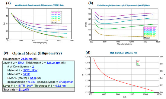 (a) Spectroscopic ellipsometry results of coated film, (b) showing that the experimental and generated model data fit well with each other, and (c,d) showing the optical model result, the measured porosity, roughness, and refractive index, which are 51%, 29.86 nm, and 1.23 at 600 nm, respectively.