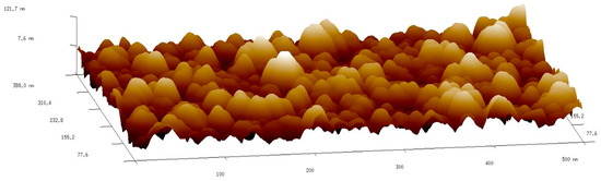 Bruker nano-atomic force microscopy was used to study the surface topography of the coatings, with dimensions of 10 nm tip size and swept area of 2 µm by 2 µm, while frequency was kept at 512 Hz. AFM scanning was carried out in five different positions, giving a root mean squared (rms) roughness of 28.5 nm. Before AFM, an ellipsometer was used to determine the porosity, thickness, and refractive index of the thin film. Ellipsometry is a technique used in optical characterization of thin films. The Cauchy model was used to extract film thickness and refractive index, while a Bruggeman effective-medium approximation was used to determine porosity of the film. Measured values of pie (ϕ) and delta (Δ) were plotted against the wavelength in the range of 300–1800 nm and then fitting was done with the model. Measurement was taken at five different angles (55°, 60°, 65°, 70°, and 75°) to determine the results with ideal approximation. Figure 7a,b shows the fitting graphs used to determine the refractive index, porosity, and thickness of the thin film. The data fitted in the model and results of the optical model are shown in Figure 7c. The determined porosity, thickness and roughness of the film were 51.3% 121.24 nm, and 29.8 nm, respectively. The SEM and AFM images confirm these values with (±5%) error of measurement. Figure 7d shows the result of measurement of refractive index with wavelength. It is clear from the graph that the refractive index is 1.23 at 600 nm. The thickness of the thin film was also confirmed by scanning electron microscope (SEM) imaging. Also interesting to note is the fact that the development of porosity inevitably leads to higher surface roughness in thin films as shown in Figure 8, invariably leading to higher wettability, as given by Wenzel’s equation [20]. AFM analysis also suggests that increase in surface roughness did not adversely affect the transmittance because it was below 50 nm, as surface roughness of higher than the wavelength of the incident light scatters the light that further reduces the transmission of the substrate [5].