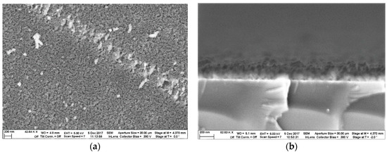 Scanning electron micrograph (SEM) images of (a) surface and (b) cross-section.