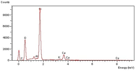 SEM images of the surface structure of the silica nanoparticle thin film are shown in Figure 9. Figure 9a shows the surface morphology of the coating, while Figure 9b shows the cross-sectional image of the coating. It is evident from Figure 9a that the surface of the coating is nano-porous, with nanoparticles of 12.5 nm on average. It was found from the size distribution of the particles that 75% –80% of the particles were in the range of the 12–13 nm. Just 10% of the particles were above 15 nm. Also worth noting is the uniformly distributed nanopores on the surface. The increased porosity and the larger vacant spaces are the reason for the decrease in the refractive index from 1.46 to 1.23 that enhanced the optical transmittance of the glass. The cross-sectional image of SEM on the right side in the Figure 9b shows that the thickness of the thin film coating is around 120–130 nm, as stated in the introduction portion. The surface roughness is also clear from the cross sectional image of SEM, which helps in the wettability of the surface, making it more superhydrophilic. The EDX graph (Figure 10) shows the peaks of silicon and oxygen with other small trace elements, showing that the coating is mainly comprised of silica nanoparticles, as reported by Goswami [41], Nakaso [42] Musić [43], and Wang [44] in their work. The result is consistent with previous work. The presence of very small traces of other elements in the EDX graph are due to contamination and handling problems.