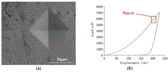 After the completion of LENS process, the samples were preceded by cutting, setting, and polishing. Next the samples were immersed in aqua regia for 10 s, and cleaned by alcohol and water afterwards. Then, the samples were dried by cold air gun. Afterwards, the microstructure and elemental analysis was examined by a scanning electron microscope (SEM) TM3030Plus (Hitachi, Tokyo, Japan) equipped with an energy-dispersive X–ray spectroscopy (EDS) A550I (IXRF, Austin, TX, USA). The micro-hardness was measured using a MVA–402TS micro-hardness tester, with 22° slant angle quadrangular pyramid diamond indenter (HDNS, Shanghai, China) by applying a 500 g force on the surface of the specimen with a 30 s duration. Then the diagonal length of the indentation was measured, and the measured length was used to check the corresponding micro-hardness with the micro-hardness table (Figure 3a). The average value was acquired by measurements that were repeated five times, to reduce errors. The complete diamond shape indentation in Figure 3a had a clear boundary, no obvious cracks and a minor pile-up effect was observed. A minor discontinuity (pop-in phenomenon) on the load–displacement curve was observed in Figure 3b, but the slight pop-in phenomenon did not imply a significant impact on the measurement of the micro-hardness [].