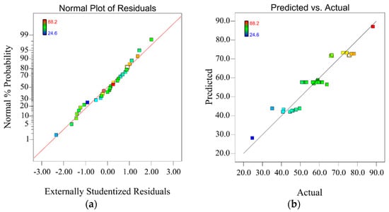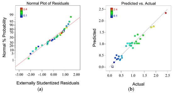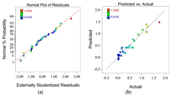 Figure 6a shows the plot of the residual factor for the wear volume model. This plot demonstrates a remarkable fit of the model indicated by the almost linear distribution of the plot. The dark reference line in Figure 6b indicates where the predicted wear volume from the model is equal to the actual testing wear volume. A close distribution of plots to the reference line is observed, which denotes a small-scale error between the predicted and actual experimental wear volume. The result shows the high prediction accuracy of the fitted wear volume model [].