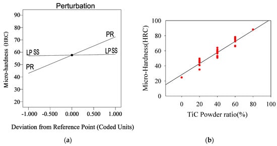 According to the ANOVA result in Table 4, as well as the plot in Figure 5a, only the TiC powder ratio presents the significance in the micro-hardness model. Figure 5b shows the micro-hardness increase with the increasing TiC powder ratio. During the LENS process, high power laser energy created rapid melting and solidification, which led to elemental diffusion, resulting in super-saturation and solid solution strengthening. With the increasing TiC powder ratio, the second phase solid solution strengthening promoted the mixture of the ionic bond, the covalent bond, and the metallic bond within the grain structure, in the composite coating [,,,]. Thus, the micro-hardness was improved.