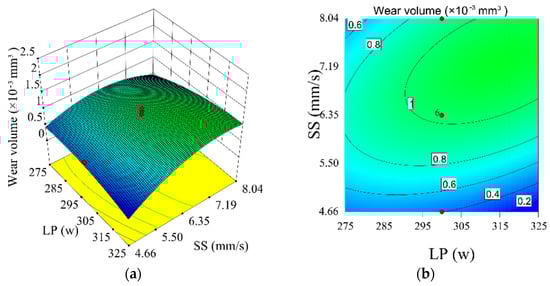 (a) 3D response surface showing the influence of laser power and scanning speed on wear volume. (b) Contour line of the response surface.