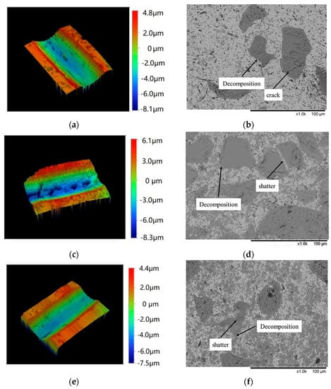 In Figure 7a,b, it can be seen that the wear volume displayed an increase followed by a decrease, with increasing laser power, while simultaneously decreasing the scanning speed. In addition, the 3D morphology in Figure 8 shows a consistent phenomenon. Initially, a low energy was received in the molten pool with a low laser power and a fast scanning speed. The TiC particles were not shattered under this level of energy. Thus, the boundary decomposition and partially sintering of TiC particles occurred, and a crack was formed during sintering (Figure 8b). Few TiC particles peel-off spots were observed in Figure 8a during the scratch testing. The slightly abrasive wear caused by the peeled-off particles led to a small wear volume. Then, a larger energy irradiation was accumulated with a larger laser power and slower scanning speed. The larger energy received by the molten pool reached the threshold to shatter the TiC particles and generate boundary decomposition (Figure 8d). However, the remaining energy after finishing the shattering was not sufficient to sinter all shattered TiC particles. The unsintered TiC particles were peeled-off during the scratch testing, which led to a severe abrasive wear and increased the wear volume, as shown in Figure 8c. Afterwards, keeping the trend of the increasing laser power and decreasing scanning speed, denoted that the molten pool absorbed more energy. Boundary decomposition and more condensed sintering were created around the TiC particles, shown in Figure 8f. These enhancements prevented the particles from peeling off during scratch testing and reforming abrasive wear to adhesive wear (Figure 8e), which reduced the wear volume [].