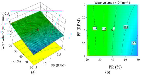 (a) 3D response surface showing the influence of the TiC powder rate and the powder feed rate on the wear volume; (b) Contour line of the response surface.