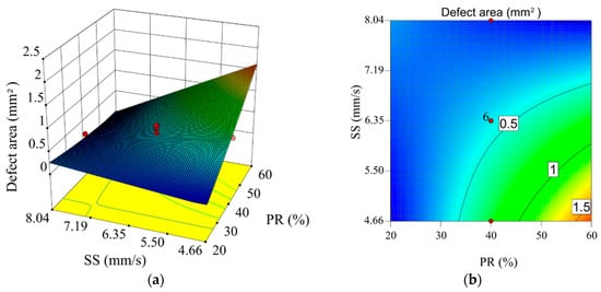 (a) 3D response surface showing the influence of scanning speed and TiC powder ratio on defect area; (b) Contour line of the response surface.