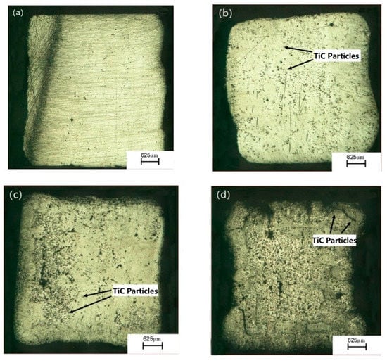 Beyond tradition materials, the materials used in additive manufacturing have expanded to composite materials []. Stainless steel has been widely used in industrial applications because of its plasticity, toughness, and corrosion resistance []. Among different types of stainless steel, AISI 316L draws the attention of researchers due to its well formability, outstanding oxidation, and corrosion resistance. However, its industrial application is limited due to its insufficient hardness and wear resistance []. This deficiency can be improved by adding a reinforcement material []. For instance, Lyu et al. used selective laser melting deposited multilayer of TiAlN/TiN coating on the substrate. By conducting orthogonal experiments they found the optimal coating with the best comprehensive property was made with a 170 W laser power, 110 mm/s scanning speed, and 0.08 mm scanning space []. Wu et al. deposited gradient SiC reinforced 316L metal matrix composite, and found that the micro-hardness and wear resistance were improved by increasing the SiC percentage []. Wang et al. applied laser melting deposition to fabricate 316L stainless steel with different levels of Cr3C2 content. They found the highest wear resistance was obtained with 15 wt.% Cr3C2 content []. Titanium carbide (TiC) is a favorable reinforcement material because of its outstanding wear resistance, corrosion resistance, and hardness []. In the past there have been numerous research work focused on TiC powder reinforcement coating. Obadele et al. [] used the laser particle injection technique, deposited titanium carbide (TiC) and tungsten carbide (WC) composite coating, and investigated the relationship between laser process parameters and the composite coating. They found the micro-hardness was improved by hard ceramic particles, which provided an effective bonding with the substrate []. Liu and Shin studied TiC-reinforced Ti6Al4V-TiC composites and found carbon induced solid solution strengthening enhanced the composite microstructure []. Zhou et al. applied selective laser melting (SLM) in fabricating Al–15Si alloy and TiC composite. They found the TiC significantly improved the micro-hardness and wear resistance of the alloy [].