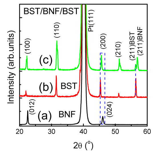 Figure 1 illustrates the XRD patterns of the three BNFs, BSTs, and BST/BNF/BST thin films were grown on Pt(111)/Ti/SiO2/Si(100) substrates, respectively. When the BNF film was annealed at 650 °C with nitrogen atmosphere, the film sample (see Figure 1a) crystallized a pure rhombohedral (R3c) distorted perovskite structure [29]. In addition, the BST film was annealed at 650 °C, the film crystallized a pure cubic perovskite structure (see Figure 1b). From Figure 1b,c, it is can be seen that BST was used as buffer-layer, the BNF films grown on Pt/Ti/SiO2/Si(100) substrate with pseudocubic phase was annealed at 650 °C in oxygen atmosphere. From Figure 1, these in-plane lattice parameters of bottom BST, BNF, and top BST thin films were obtained; the results were 4.001(4), 3.961(1), and 3.996(4) Å, respectively for bottom BST, BNF and top BST thin film. Stryukov et al. reported that when the Bi0.98Nd0.02FeO3 thin films growth on the Ba0.8Sr0.2TiO3 buffer-layer with tetragonal phase, the heterostructures Bi0.98Nd0.02FeO3/Ba0.8Sr0.2TiO3 on (100)MgO substrate has a monoclinic structure with the space group Cc at room temperature [29]. Thus, the BST layer is conducive to the growth of BNF crystals. The BST and BST/BNF/BST thin films display polycrystalline structure and without any secondary phases. Typically, the BNF film is annealed in an oxygen atmosphere and a second phase appears [30]. The crystal structure of the BNF thin films can be controlled by using BST buffer-layer and annealing atmosphere.
