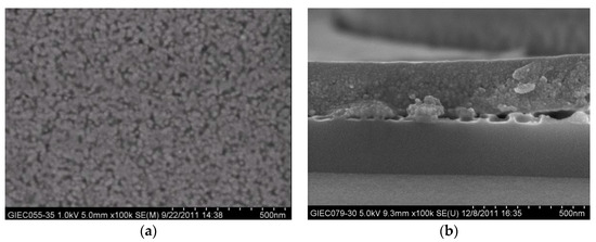 The SEM images of surface (a) and cross-section (b) of the BST/BNF/BST films on Pt(111)/Ti/SiO2/Si(100) substrates annealed 650 °C for 30 min in an oxygen atmosphere.