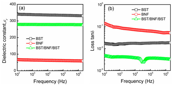 In general, the equivalent capacitor of multilayer structure thin films may be expressed by series capacitors [32,33,34]. For the εr value of multilayer thin films, the effective capacitor was constructed by three capacitors, include of top CBST, CBNF, and bottom CBST capacitors, respectively. Compared the reported about dissipation factor in (Pb,Sr)TiO3/(Bi,La)FeO3/(Pb,Sr)TiO3 trilayered structure [35], there is extremely low loss tanδ in the BST/BNF/BST thin films. In Figure 3b, the multilayers thin films have very low loss tanδ, the degree of the loss tanδ was ~10−3 from 100 Hz to 2 MHz. The bismuth’s volatilization was limited in annealed processing by bottom and top BST layers, making the Bi/Fe in good station in BNF layer; it also improved the technology of preparation bringing down the defect rate of BST/BNF/BST film, and reducing the number of free-carriers.