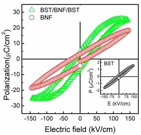Figure 5 shows the leakage current density (J)–electric field (E) characteristics of BST/BNF/BST and BNF film on (111) Pt/Ti/SiO2/Si substrate. The current demsity (J) of BST/BNF/BST is ~10−8A/cm2 at RT and 100 kV/cm. Which is lower than that of the BNF film. In addition, in the BNF, the J value increases rapidly with an increasing E value. Scott et al. reported that the J value of PZT films can be reduced by decreasing oxygen vacancies (OVs) [43], and they reduced the Fe3+ valance state in BiFeO3 film by annealed in nitrogen atmosphere [29,44]. In the quite low leakage current system, films annealed in oxygen can be reduced OVs in BST layers and the BST layers cut off the BNF layer with air reducing the Fe3+ valance state. Thus, the J value was low due to reduced OVs and Fe3+ valance state. Moreover, the interface of ferroelectric BST layer and ferromagnetic BNF thin films plays an important role in the charge transfer between thin film and electrode interface and reducing the J value.