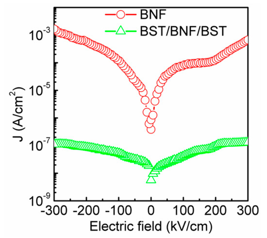 J–E characteristics of BNF and BST/BNF/BST films on Pt(111)/Ti/SiO2/Si(100) substrate measured at room temperature.