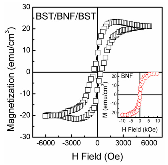 Figure 6 shows the magnetization (M)–magnetic field (H) loops of the BNF and BST/BNF/BST films on Pt(111)/Ti/SiO2/Si(100) substrates at RT. For the single layer BNF film, the inset of Figure 6 shows the loop in a slim shape and reaches saturation at low magnetic field (about 5 kOe). In the BST/BNF/BST thin film, there are higher remnant magnetization (Mr) and the lower coercive magnetic field (about 10.1 emu/cm3 and 351 Oe). The value of Mr is slightly larger than tha of the saturated magnetizations (Ms = 7.14 emu/cm3) for the PST/BLF/PST [35]. Thakuria and Joy reported that the Ms and Mr values of the nanocrystalline Bi0.875Nd0.125FeO3 are ~1.3 and 0.20 emu/g, respectively [45]. Ederer et al. reported that the OVs can alter the magnetization slightly in the heterostructure BiFeO3/Ba0.25Sr0.75TiO3, and lead to the formation of Fe2+ [46]. The BST/BNF/BST film has a more optimized ferromagnetic than single BNF thin film that might be attributed to the bismuth’s volatilization when inhibited by BST layers, bringing down the defect rate of BNF film and making the Bi/Fe in good station; the BST layers advanced the superexchange coupling of ferrite or double exchange of Fe2+ and Fe3+ ions and the incorporation of OVs in the BNF thin film play a key role in enhanced magnetization in BST/BNF/BST thin film.