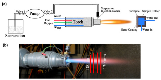 (a) Schematic of the suspension HVOF system for nanostructured TiO2 coating. (b) Digital image of the HVOF propylene flame with suspension.