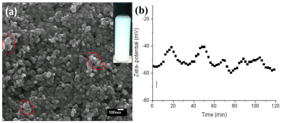 The prepared suspension was dried and the particles were observed by SEM (Figure 2a). The nanoparticles were distributed uniformly within the suspension, with small agglomerates only about several hundreds of nanometres in size (circled in Figure 2a). No stratification could be observed in the sedimentation test even after the TiO2 suspension had been left untouched for 36 h (inset in Figure 2a). In order to further characterise the stability of the 5 wt.% TiO2 suspension, the zeta potential was monitored over a period of 120 min (Figure 2b). When the zeta potential is higher than 30 mV or lower than −30 mV, it is accepted that the suspension can resist strong agglomeration and can be electrically stabilized [19]. During the first 60 min, the electrokinetic potential varied between −41 and −57 mV, and then tended to stay stable with little variation between −49 and −56 mV. This was because the electrical charge at the double layer of particles in freshly prepared suspensions is not electrically stabilized [20] and the equilibrium state between particles and dispersed solution can be reached in 1 h for suspensions with a solid content of 5 wt.%.