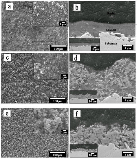 SEM images of surface and cross-sectional coating morphologies: (a,b) S1, (c,d) S2 and (e,f) S3.