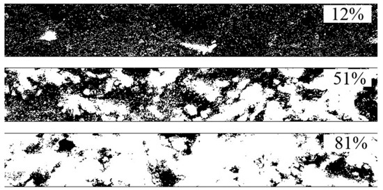 Binary images of suspension HVOF TiO2 coatings converted from their greyscale images by image thresholding in order to assess the melting percentages: S1 (12%), S2 (51%) and S3 (81%).
