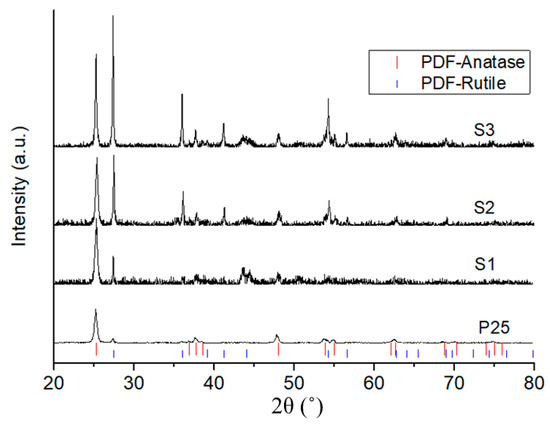 The cross-sectional images were converted from greyscale images into binary images using a threshold to evaluate their extents of melting, as shown in Figure 4. The extent of feedstock melting was ca. 12%, 51% and 81% for coatings S1, S2 and S3, respectively. The crystalline structure of the coating was analysed by X-ray diffraction patterns, as shown in Figure 5. The P25 nanopowder was composed of anatase and rutile phases in the proportion 81:19. No other phases were observed in the coatings compared with P25 feedstock, except the peaks at around 44.5° that revealed the austenite phase of the stainless steel substrate due to the low thickness of the coating. An increase of rutile peak intensity was observed in the XRD patterns for the coatings compared with P25 powder. This indicated that anatase-to-rutile phase transformation occurred during the deposition process because of heat transfer from the HVOF flame jet. The rutile content (CR) was 23.6%, 63.0% and 70.0% for coatings S1, S2 and S3, respectively, a tendency consistent with the extent of feedstock melting observed by SEM. More fully-melted regions in the coating led to higher CR, which is consistent with results in [22].
