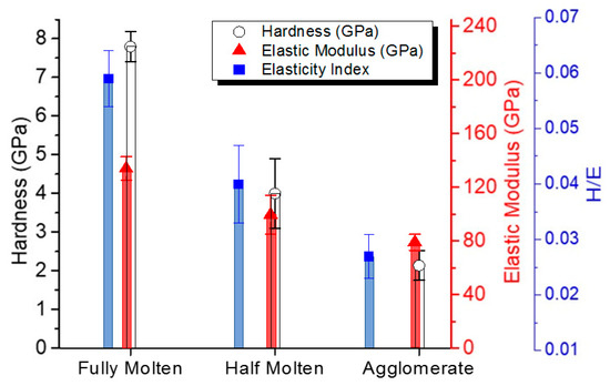 The extent of the recovery during nano-indentation depends on the hardness-to-elastic modulus ratio (H/E). The H/E is an indicator of a material’s capacity to absorb or dissipate energy, which is lower for more plastic materials and becomes higher for more elastic materials. The fully melted zones had the highest elasticity index and showed superior elastic property, while the agglomerated zones were more plastic (e.g., Figure 6 and Figure 7). SEM examination of indents on a number of melted zones revealed that there were no cracks present around the indents (Figure 7). All the indentation areas were smooth, without any sign of incipient crack formation or material accumulation. A shallow and small indentation impression was observed for fully melted zones, compared with much larger ones for agglomerated zones (e.g., Figure 7a,c).