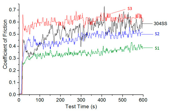 As the thickness of the deposited coatings was very thin (less than 20 μm, compared with several hundreds of micrometres for conventional thermal sprayed coatings), the reciprocating wear test only ran for 600 s to avoid the effect of the substrate. The as-sprayed surface roughness did not seem to be critical for wear and friction performance of the developed coatings in the study when their Ra varied between 0.53 and 1.18 µm (Table 3). Suspension HVOF TiO2 coatings prepared in this study had various wear rates, in the range of 0.83–5.13 × 10−7 mm3/Nm. The coefficient of friction varied from 0.35 to 0.62, which is lower than that of conventional plasma sprayed and suspension HVOF TiO2 coatings obtained from dry sliding ball-on-disc tests using the same counterpart 6 mm Al2O3 ball but with a load of 2 N as found in the literature, i.e., ca. 0.90 [30]. With the increase of the melting extent, the friction coefficients increased though the wear resistance varied differently. The coefficient of friction curves of different samples (Figure 8) indicated that all the suspension HVOF TiO2 coatings had smoother curves compared with that of 304SS, regardless of the extent of the melting of the feedstock. However, the coatings with different melting conditions of feedstock had very different coefficient of friction values. The coating with mostly agglomerated particles (S1) showed the lowest coefficient of friction, and the coating with mostly fully melted particles (S3) presented the highest coefficient of friction. It can be assumed that coefficient of friction is related with particle melting extent, which is then reflected by phase structure, i.e., anatase has a lower coefficient of friction than rutile.