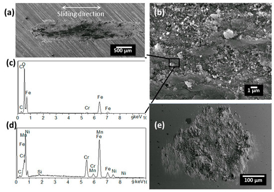 In order to further study the wear mechanism, the surface morphologies of the wear scars were examined by SEM. Uncoated 304SS substrate had a specific wear rate of 5.13 ± 0.04 × 10−7 mm3/Nm (Table 3). Its coefficient of friction varied between 0.38 and 0.72 (Figure 8), consistent with the typical values for the contact between ceramic and metallic materials [31]. The large fluctuations in the data were typical for poor tribological materials with significant adhesive wear and stick-slip tendencies. Wear scar analysis confirmed that a large amount of wear debris from the substrate adhered to the contact surfaces of both the substrate and the counterpart Al2O3 ball (Figure 9). Severe plastic deformation of steel wear debris and the generation of a series of grooves on the wear scar surface indicated that two-body ploughing also occurred during the wear process (Figure 9a,b). The presence of a high amount of oxygen (overlap with Cr peak) on the 304SS surface (compared with EDS analysis of bare 304SS substrate in Figure 9d) indicated strong oxidation due to elevated temperatures between the contact surfaces (Figure 9c). The wear process of uncoated 304SS substrate was dominated by adhesive wear and two-body ploughing and had a typically fluctuating coefficient of friction curve.