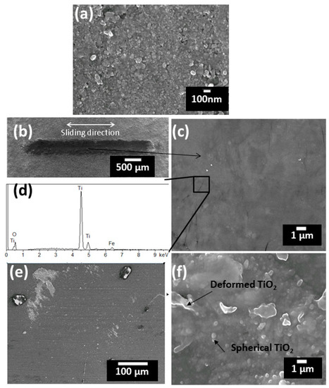 It is widely considered within the thermal spray community that a higher amount of fully melted splats is essential for improving the strength of thermal spray coatings [32] and, as a result, coatings composed of mostly agglomerate particles have received much less attention, especially for tribological applications. In this study, coating S1, with a feedstock melting percentage of 12% (CR = 23.6%), showed a very low coefficient of friction and low wear rate (Figure 8 and Figure 10). High magnification examination of the coating in the cross-section showed that it was mainly composed of agglomerated spherical granular TiO2 particles (Figure 10a). From the SEM analysis, the wear scar was small and had a smooth surface without wear debris (Figure 10b,c). Only a few small localized cracks shorter than 3 μm (as observed under SEM) and perpendicular to the sliding direction could be seen on the worn surface (Figure 10c). It is assumed that the existence of agglomerated granular particles plays an important role in arresting and deflecting crack propagation during wear. The act of applying the test load led to a densification of the coating on the worn surface and a layer of compact tribo-film was therefore formed by the deformation of splats, which was mainly TiO2 (Figure 10a,c), which provided a low coefficient of friction. The EDS analysis revealed the exposure of substrate material (iron) as the coating was worn through (Figure 10d), indicating that the tribo-film can be continuously formed and worn off because of the much higher hardness of the Al2O3 ball compared with that of the coating. Only very little TiO2 debris was found adhering onto the surface of the Al2O3 ball because of the formation of tribo-film (Figure 10e). Therefore, the improved friction and wear properties of the coating composed of mostly agglomerated feedstock can be ascribed to the effective hindrance of crack generation and propagation of the granular feedstock, which leads to enhanced integral deformation resistance of the nanostructured coatings.