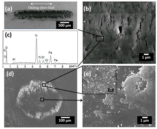 Wear track of coating S3 under (a) low magnification and (b) high magnification; (c) EDS analysis of area in image (b); wear scar of counterpart Al2O3 pin under (d) low magnification and (e) high magnification.
