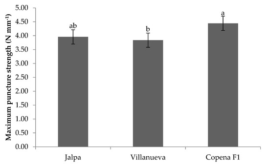 Maximum puncture strength (N·mm−1) of the edible films based on the mucilage of three cultivars of Opuntia ficus-indica. Values with different letters are significantly (p ≤ 0.05) different. The bars represent the standard error.