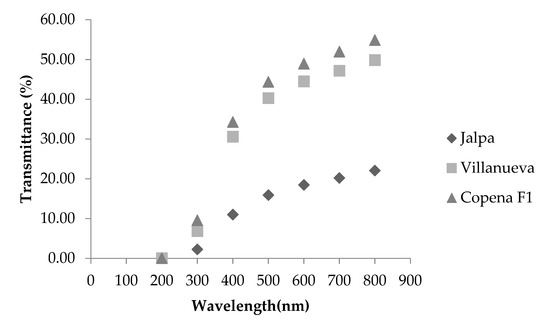 Mucilage films can be used in product packaging. Therefore, the light transmission rate and the transparency of the films are important for their applications. The visible region from 200 to 800 nm was selected to measure the light barrier properties [28]. The light transmission rate (Figure 3) indicates that the film of the cultivar Copena F1 had the highest percentage of transparency. All three films had excellent UV light barrier properties at 200 nm, but as the nanometer value increased, this barrier descended. The film made from the cultivar Jalpa conserved this barrier from 300 to 800 nm. This behavior is similar to that reported by Fang et al. [30], Nouraddini et al. [2] and Thakur et al. [48], due to the nature of the polymer used. Regardless of the plasticizer used, with increasing wavelength, the light transmission rate increased, and it was too difficult to determine the relationship between the transparency and compounds in the films [28]. However, the most transparent film was that using Copena F1 (3.81), and it can be assumed that the light barrier properties of the mucilage decide the transparency of the films. The transparency values of some commonly used synthetic films were reported by Shiku et al. [29]: low-density polyethylene (3.05), orientated polypropylene (1.67), and polyvinyldichloride (4.58). Other reports found similar values for transparency, such as Caamal-Herrera et al. [49] reporting values from 1.53 to 6.38 for films of corn starch-cassava-phaseolus lunatus, and Salinas-Salazar et al. [50] reporting values from 1.20 to 5.44 for films of cactus mucilage-beeswax-grenetine. Therefore, the values obtained suggest that coatings based on the mucilage of Opuntia ficus-indica can be used for foods susceptible to light exposure with a better visual representation of the product.