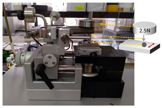 Tribological tests were performed using a tribometer in a ball-on-plate configuration (standard tribometer, CSM Instruments, Peseux, Switzerland, Figure 6) operating in reciprocating mode [41,42]. Chrome steel balls AISI 52100 (diameter: 6 mm, hardness: 803 HV, roughness < 0.032 μm) were run against AISI 420 stainless steel plates (40.5 mm × 21 mm × 5 mm, hardness: 194 HV) with a mirror finish polishing (roughness, Ra, lower than 11 nm). The type of steel selected for the plate is much softer than the ball, so wear occurs mainly on the plate. AISI 52100 is used in the manufacture of anti-friction bearings, in gears, internal combustion engines, etc. AISI 420 is often used in the automotive sector. Balls and plates were cleaned with a stream of hexane and dried with hot air before the tests. As indicated previously, TMPTO is used as hydraulic oil. Several hydraulic systems have meshing gears as components. The typical maximum Hertzian contact pressure in a gear contact is around 1 GPa. Tests were conducted at room temperature (~296 K) under a normal load of 2.5 N which corresponds to a maximum contact pressure of 0.88 GPa (mean contact pressure of 0.59 GPa), at a stroke length of 10 mm, maximum speed of 0.10 m·s−1, and a sliding distance of 500 m. The room humidity was kept close to 50%. The test was started with the CSM Tribox software (version 4.0). During the test, the software and an inductive displacement transducer enabled recording of the frictional force and the friction coefficient. At least three replicates were run for each concentration.