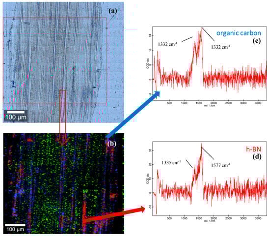 Raman spectra on the worn surfaces were recorded with a Raman confocal microscope. Figure 11 shows the results obtained for the surface tested with the nanolubricant containing 0.75 wt.% in h-BN. As can be observed in this figure, the formation of boundary tribofilms containing h-BN (red areas in Figure 11b) is clear, although the signal corresponding to this compound (around 1360–1367 cm−1 in Figure 11d) is overlapped with that of the organic carbons of the base oil (in blue). The deconvolution of this spectrum shows the peaks of carbon and h-BN separately (Figure S2). Similar results have been previously found by Charoo et al. [20] with a SAE 20W-50 oil containing h-BN nanoparticles. These tribofilms decrease the shearing resistance favoring the sliding of both contacting surfaces and could serve as polishing pad to reduce the roughness of the worn surface. In addition, it can be observed that the h-BN nanoparticles are located along several furrows (see Figure S3) on the worn surface; i.e., the mending effect takes place, also resulting in a smoother surface.
