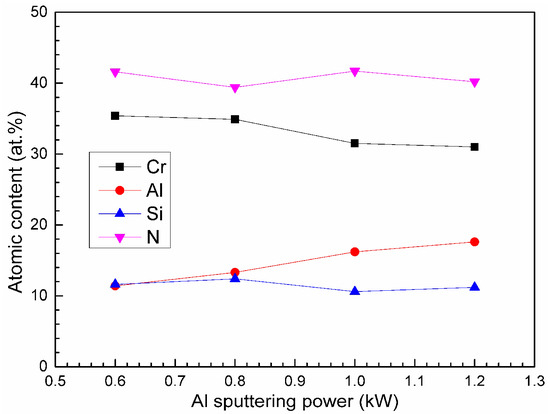 The chemical compositions of the four CrAlSiN coatings deposited under different Al sputtering power are presented in Figure 1. As the Al sputtering power increased from 0.6 to 1.2 kW, the Al content in the four CrAlSiN coatings increased from 11.4 to 17.6 at.% gradually, which was attributed to the fact that more Al atoms could be sputtered out, transported to and deposited on the substrate at higher sputtering power. The Cr content decreased a little with increasing Al sputtering power. The Si content versus Al sputtering power curve fluctuated a little and remained around 11.0 at.%. The N content in the four CrAlSiN coatings also varied a little around 41.0 at.%.