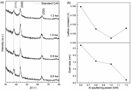 Note that the diffraction peaks of the CrAlSiN coatings shifted to higher angles, and the diffraction peak of the (200) crystal plane became broader as the Al sputtering power increased from 0.6 to 1.2 kW. This might have been due to the diminution of the grain size of the CrAlSiN coatings. Figure 2b shows the average grain sizes of the CrAlSiN coatings calculated by Scherrer equation using (200) peaks. It can be seen that the grain size of the CrAlSiN coatings decreased gradually from 8.72 to 6.22 nm with increasing Al sputtering power. The lattice constants were also calculated using the Bragg equation using the same (200) peaks. The lattice constants of all the four CrAlSiN coatings were smaller than the standard lattice constants 4.14 Å (PDF# 11-0065), since the radii of Al and Si atoms are smaller than that of Cr, which renders that the replacement of Al and Si atoms for Cr atoms in the CrN crystal lattice decreasing the crystal lattice constants [7]. The lattice constants decreased gradually until the Al sputtering power reached 1.0 kW due to the dissolution of larger quantity of Al atoms. After that they were enlarged unexpectedly as less Al atoms would be dissolved in finer CrN crystals.