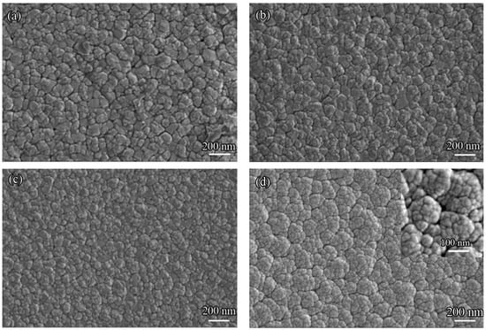 Figure 3 presents the surface morphologies of the four CrAlSiN coatings. As can be seen in Figure 3, the surface of all the four coatings was dense and composed of small irregularly shaped particles. The particle sizes became smaller when the Al sputtering power increased from 0.6 kW to 1.2 kW, which was due to the fact that the incorporation of Al element decreased the grain sizes of the fcc-(Cr,Al)N phase. However, it was obvious to observe that small granular particles aggregate into larger cauliflower structures on the surface of the CrAlSiN coating with Al sputtering power about 1.2 kW, resulting in rougher surface and more voids being generated. The surface roughness of the four CrAlSiN coatings was measured by surface profilometer, as shown in Figure 4. It decreased initially, and then increased when the Al sputtering power reached 0.8 kW. The CrAlSiN coating with 0.8 kW Al sputtering power possessed medium particle size and smallest surface roughness. While the CrAlSiN coating deposited with Al sputtering power about 1.2 kW possessed the highest surface roughness caused by the formation of uneven cauliflower structures.