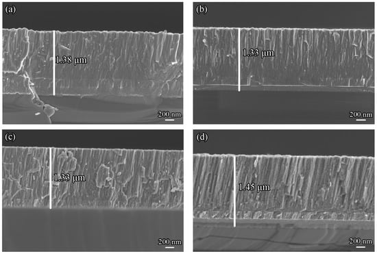 Cross-sectional images of the four CrAlSiN coatings deposited under different Al sputtering power (a) 0.6 kW (b) 0.8 kW (c) 1.0 kW and (d) 1.2 kW.