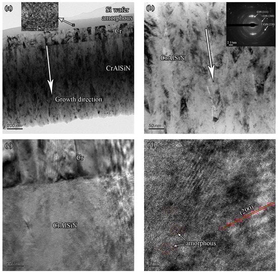 A higher-magnification image of the CrAlSiN layer is presented in Figure 6b. It further verified that the CrAlSiN coating possessed columnar structure with crystalline grains elongated along the growth direction. The columnar structure possessed clear boundaries and the diameter of single column was estimated between 50–100 nm. The SAED pattern of this zone consisted of polycrystalline rings which corresponded to (111), (200), (220) and (311) diffraction peaks of the fcc-CrN phase. It was consistent with the XRD diffraction outcomes that only the diffraction peaks of fcc-CrN phase were detected in the CrAlSiN coating. In Figure 6c, the columnar CrAlSiN layer seemed to be composed of multilayers (bilayer thickness ~3 nm). Since three individual Al, Cr and Si targets were used during the deposition process, alternate fcc-(Cr,Al,Si)N layers with slight composition difference might be formed. In the high-resolution image (Figure 6d), the coating microstructure was observed to be fcc-CrN crystal with (200) lattice fringes being surrounded by scattered amorphous phase. The continuing lattice fringes extended more than 9 nm which was three times larger than the bilayer thickness. It revealed that the CrAlSiN coating formed in epitaxy growth by the template effect. As mentioned above, the surface energy dominated the total energy. Thus, the CrAlSiN coating tended to grow in columnar structure with coherent interface, since it would minimize the interface energy [21]. In addition, the coherent interface might play a role in hindering the formation of amorphous zones, since only small-sized amorphous zones were found in Figure 6d.