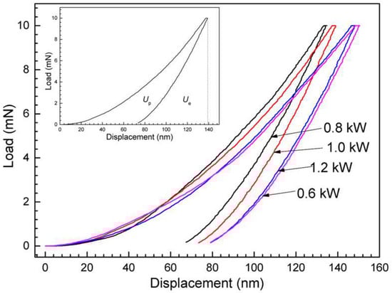 Representative load versus displacement curves of the four CrAlSiN coatings deposited under different Al sputtering power.