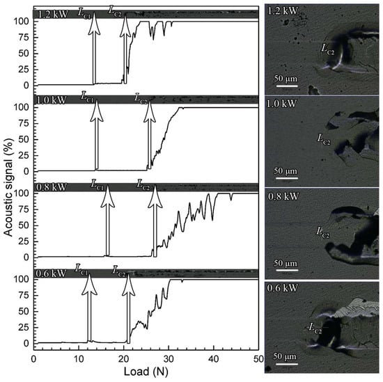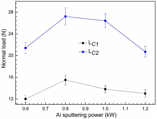 The LC1 and LC2 values of the four CrAlSiN coatings obtained from Figure 8 are drawn in Figure 9. It can be seen that both of the LC1 and LC2 values of the CrAlSiN coatings were enhanced firstly and then dropped down subsequently, as the Al sputtering power increased. The CrAlSiN coating with 0.8 kW Al sputtering power possessed the maximum LC1 and LC2 values about 15.5 and 27.2 N respectively. The adhesive strength is relevant to hardness, surface roughness, residual stress, atomic bonding, compactness and defects in the coating [27,29]. High hardness is beneficial for decreasing the stress and plastic deformation of the contact zone between the coating and indenter, which results in higher resistance to cracking and better adhesion to the substrate. Elastic modulus (E*) also affects the adhesive strength. It is reported that higher H/E*, H3/E*2, and We values are in favor of enhanced adhesive strength [30,31]. The CrAlSiN coating with 0.8 kW Al sputtering power possessed the largest hardness, H/E*, H3/E*2 and We values which could explain for its high adhesive strength. The CrAlSiN coating with 1.2 kW Al sputtering power possessed higher H/E* and H3/E*2 values than the coatings deposited at 0.6 kW and 1.0 kW, but it had lower adhesive strength which might have been due to its larger surface roughness, since a rough surface would lead to higher internal stress accelerating the deformation and cracking of the coating.