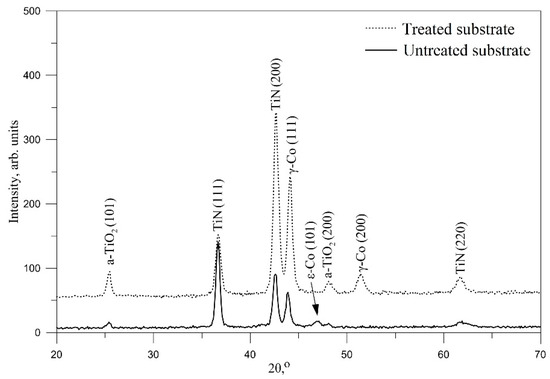 Figure 2 presents the experimentally obtained XRD patterns of both treated and untreated coated specimens. Аll diffraction maxima were indexed. There were some peaks belonging to the Co substrate as well as to the TiN and TiO2 from the coatings. It was clear that, before the treatment process, the phase composition of the substrate consisted of a mixture of ε-Co and γ-Co. The presence of double-phase structure before the surface treatment can be explained by a reaction of γ-Co → ε-Co, which occurred at 880 °C during the cooling process. After the EBT, it was transformed into a single-phase structure of γ-Co. It should be noted that cobalt exists in two allotropic forms: ε-Co, which has a hexagonal close-packed (hcp) structure and appears at low temperatures, and γ-Co, which has a face-centered cubic (fcc) structure and is stable at high temperatures. The Gamma cobalt phase is known as a high-temperature modification of the material, and the discussed fcc structured phase is also known to be unstable at room temperature. However, Granqvist et al. [26] mentioned that it can exist in the form of ultrafine particle structure. It is known that treatment techniques by high-energy fluxes are capable of finer microstructure formation. This statement is in agreement with the results obtained for the phase composition of the substrate with and without electron beam treatment. Furthermore, the authors of [27,28] mentioned that the transition from γ to ε phases during cooling after the manufacturing process is sluggish, and some traces of fcc structure can be found. During electron beam surface modification, the cooling rate is quite high, and the discussed transformation from hcp to fcc does not occur as the transition process is sluggish. Similar results were obtained by the authors of [29], where a Co–Cr alloy implant was subjected to laser interface lithography modification. This is completely in agreement with our results, where the treatment processing of the substrate surface formed a single-phase structure of γ-Co.
