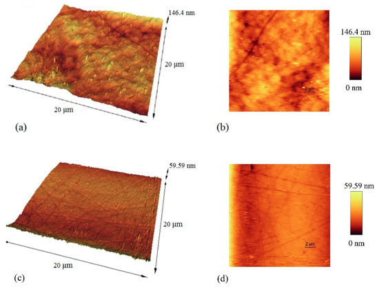 The nanosurface topology was studied by means of atomic force microscopy (High-speed AFM, Anfatec Instruments AG, Oelsnitz, Germany). The experiments were performed in noncontact mode, where the curvature radius of the silicon nitride tip was 10 nm. A small-size scanned area of 20 μm × 20 μm along the x- and y-axes was chosen, and 512 measurements of the heights were taken at each of these directions (i.e., 512 × 512 measured points for the area).