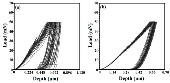 Penetration curves of the indenter of (a) TiN/TiO2 coating deposited on treated Co–Cr substrate and (b) TiN/TiO2 coating deposited on untreated Co–Cr substrate.