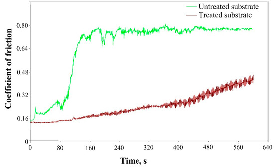 The COF on the surfaces of both samples was measured by wear test at a load of 2 N and for 600 s, and the results are shown in Figure 6. Also, the mean friction coefficients of the investigated specimens are summarized in Table 2. The results obtained by wear investigations revealed that the COF was about 0.65 in the case of deposition of bilayer TiN/TiO2 on untreated Co–Cr and significantly decreased down to 0.24 when the same coating was deposited on an EBT substrate. For a better understanding of the friction behavior of the deposited coatings, the experimentally obtained friction curves were extensively analyzed. At the starting point, the COF of both specimens was very similar, reaching values of 0.18. In the case of the bilayer TiN/TiO2 deposited on the untreated substrate, COF increased gradually with increasing sliding time (to about 150 s) and reached values of about 0.8. Also, some fluctuations in the COF were visible in the later stages of the wear test up to 300 s, suggesting the formation of debris. With regard to the sample with deposited bilayer TiN/TiO2 on electron beam-treated substrate, the coefficient of friction was about 0.15 in the beginning and increased constantly during the measurement, up to about 0.4. No fluctuations were registered, meaning that the deposited coating on electron beam-treated Co–Cr was significantly more ductile compared to the untreated substrate. As already mentioned, TiN surface with (200) orientation exhibits much more affinity to oxidation and provides available sites for oxygen molecule adsorption. This means that the zone between the nitrogen and oxygen part of the coating (i.e., the oxynitride region) should be larger due to the diffusion of the oxygen in the TiN layer [34], meaning that the thickness of the oxide–nitride layer should be a bit larger in the case of deposition on the treated substrate. It follows that the coating deposited on EBT substrate can be characterized with higher ductility, which is in agreement with the results for the coefficient of friction.