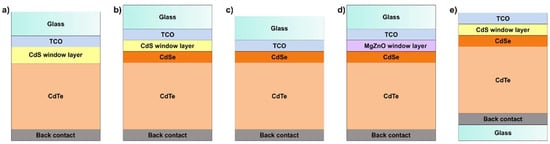 Schematics of deposited layers for solar cells (intermixing not depicted, thicknesses not to scale) for (a) a conventional CdTe device, (b) a device with a CdSe layer between CdTe and CdS []; (c) a device with CdSe replacing CdS [,]; (d) a device with MgZnO and CdSe replacing CdS []; and (e) a device in substrate configuration with a CdSe layer between CdTe and CdS [].