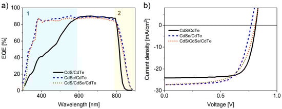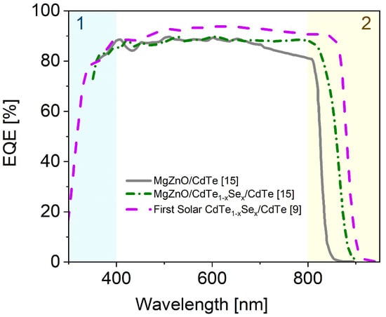 Further improvement was achieved by using a CdTe1−xSex layer at the front of the CdTe absorber. With an 800 nm thick CdTe1−xSex layer in front of a CdTe absorber, Munshi et al. showed an improvement in device efficiency from 17.9% for a MgZnO/CdTe device to 19.1% in a MgZnO/CdTe1−xSex/CdTe device (see Table 3) []. They improved the JSC by 2.1 mA/cm2 while retaining the high VOC (see Figure 5a). As the device contains no CdS, the EQE in the short-wavelength region is improved (region 1 in Figure 5a).