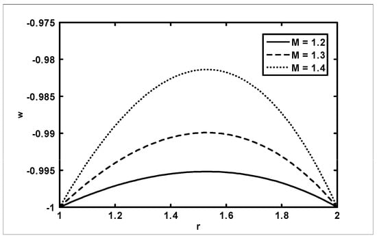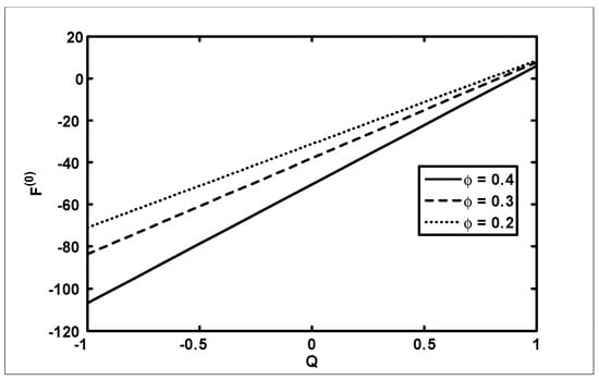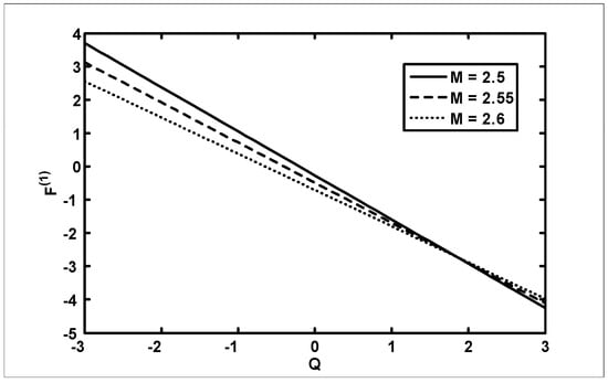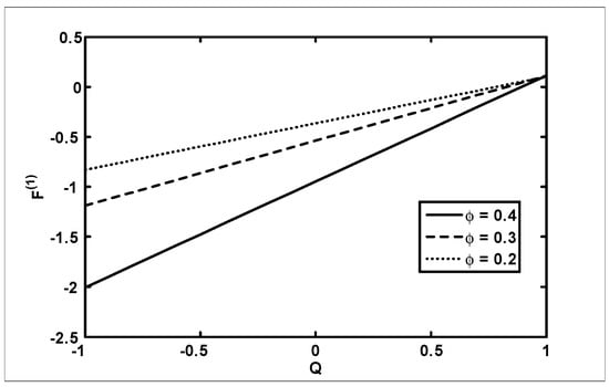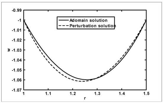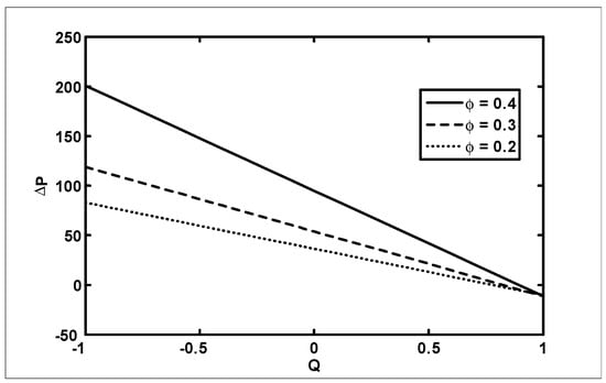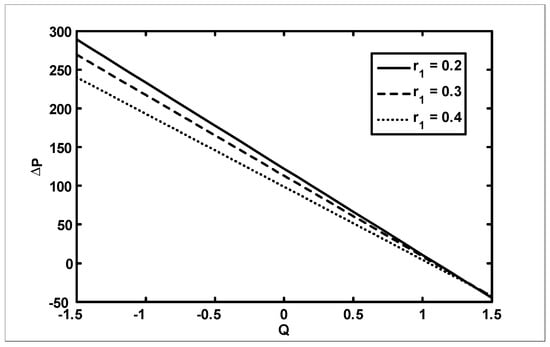 The objective of the current analysis is to present the closed form solutions of MHD Newtonian fluid with variable viscosity. The expression for pressure rise per wavelength and frictional forces are difficult to integrate analytically; therefore, numerical integration is used to evaluate the integrals. Figure 2, Figure 3 and Figure 4 are plotted for pressure rise and friction force against flow rate when viscosity is constant. In Figure 2, it is observed that pressure rise increases with an increase of up to , after which the curves intersect each other and, finally, it gives an opposite behavior. The effects on (for outer tube) and (for inner tube) are presented in Figure 3 and Figure 4. It is depicted from Figure 3 and Figure 4 that with an increase in , both and decrease for small and, finally, the behavior is reversed at the end. A comparison of the velocity field for constant viscosity case is made between the Adomian decomposition solution and perturbation solutions obtained by [6]. (see Figure 5). Figure 6, Figure 7, Figure 8 and Figure 9 are prepared when (viscosity) . It is observed from Figure 6 that in the retrograde and peristaltic pumping regions, the pressure rise decreases with an increase in amplitude ratio . Figure 7 and Figure 8 show that and give an opposite behavior as compared with . The velocity field increases with the increase in and the maximum value of the velocity is at the center (see Figure 9). Figure 10, Figure 11, Figure 12 and Figure 13 are prepared when the viscosity It is observed from Figure 10 that with an increase in , the pressure rise decreases in the retrograde , peristaltic pumping , and copuming regions. It is depicted from Figure 11 and Figure 12 that with an increase in , both and decrease for small and, finally, the behavior is reversed at the end. The velocity profile for different values of for the case when viscosity is is shown in Figure 13. It is observed from Figure 13 that the magnitude value of the velocity profile decreases with an increase in .