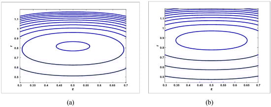 The trapping phenomenon is an interesting phenomenon in peristaltic motion, which is discussed in Figure 14, Figure 15, Figure 16, Figure 17 and Figure 18 for the case when , and Stream lines for different values of for the case when are shown in Figure 14. It is observed from Figure 6 that with an increase in amplitude ratio , the size of the trapping bolus increases. Stream lines for different values of and for the case when are shown in Figure 15 and Figure 16. It is observed from Figure 15 that the size of the trapping bolus decreases with an increase in Hartmann number . The size of the trapping bolus increases with an increase in amplitude ratio (see Figure 16). Stream lines for different values of and for the case when are shown in Figure 17 and Figure 18. It is observed from the Figures that the size of the trapping bolus increases with an increase in Hartmann number and amplitude ratio