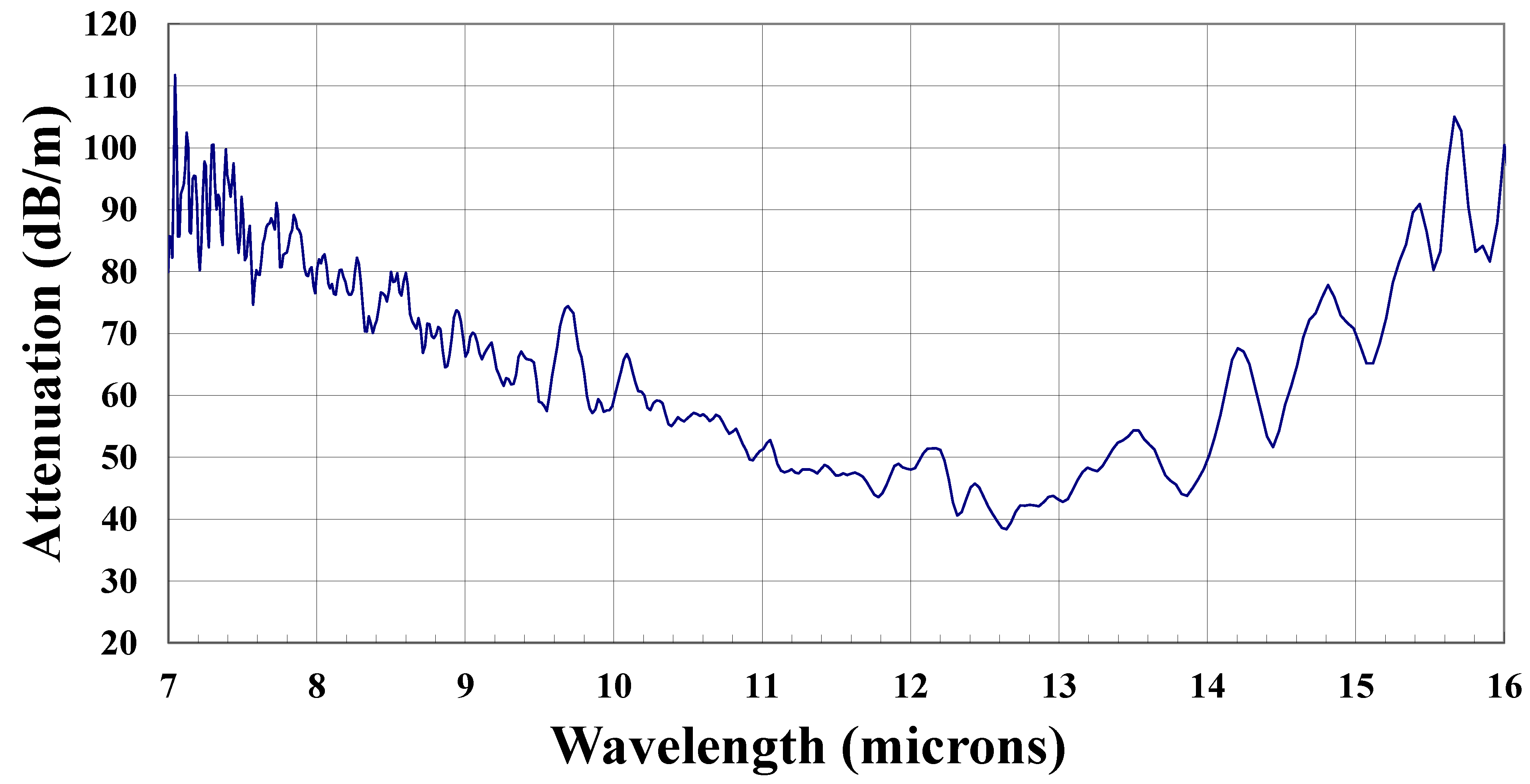 The optical properties of the resulting fibers are characterized using an FTIR spectrometer Tensor 27 from Bruker equipped with a fiber coupling attachment using gold coated concave mirrors and an external Mercury-Cadmium-Telluride (MCT) detector. The fiber attenuations are measured using the cut-back method over the full infrared range. The typical fiber diameter used for loss measurement was ~250 microns