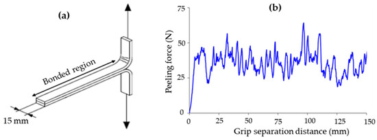 (a) Peeling test specimen geometry; and (b) the peeling test result of the two layered Flax/PP laminate.