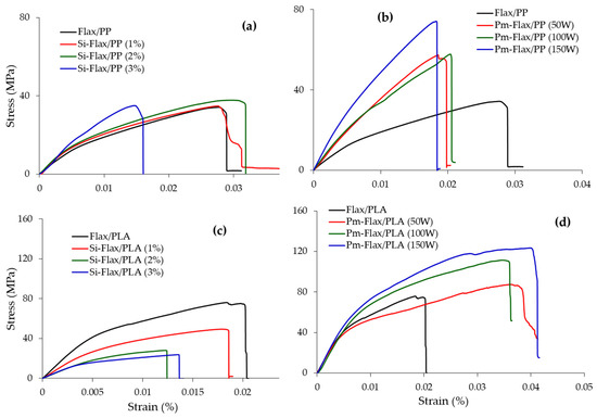 Stress–strain curves of (a,b) Flax/PP and (c,d) Flax/PLA single layered laminates from the fabrics treated with (a,c) silane at different concentrations and (b,d) atmospheric plasma with different plasma flame intensities.